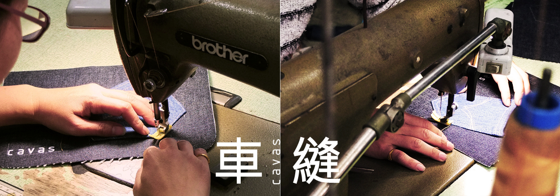 外層黑色丹寧布手工刷白後水洗、黑色內襯、黑色車縫線