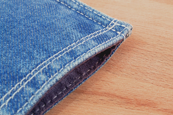 外層藍色丹寧布漂白為淺藍後水洗 、灰色內襯、白色車縫線