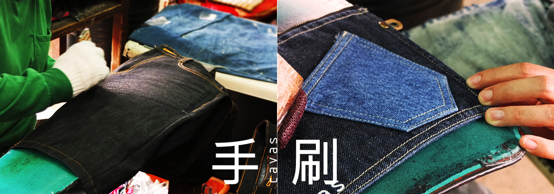 外層藍色單寧布手工刷白後水洗再加上復古套色、咖啡色內襯、金黃色車縫線